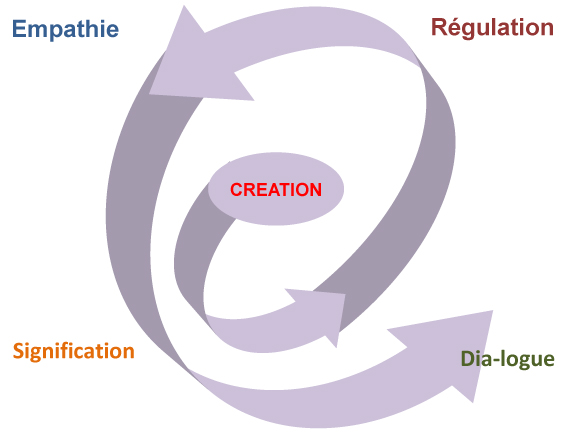 Nous avons défini quatre dimensions essentielles de la production de sens dans l’activité et les organisations: l’empathie, la régulation, la signification et le dialogue. A partir d’observations, d’entretiens, d’enregistrements de discussions, d’apports spontanés, nous créons une cartographie des verbatims selon ces quatre dimensions, qui permet ensuite de dessiner les chemins de création propre à l’organisation.